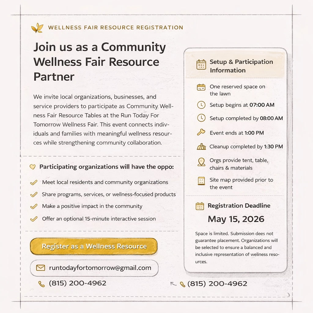 Be part of a meaningful community experience by hosting a resource table at the Run Today For Tomorrow Wellness Fair. We invite local organizations, businesses, and service providers to connect with residents, share wellness-focused resources, and help create a supportive, inclusive space centered on mental health and overall well-being.